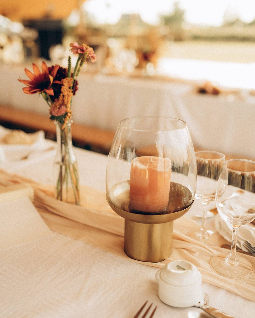 Nous avions placé un voilage crème en guise de chemin de table sur des nappes banches, mais aussi nos photophores « Josephine » et « Rose », des fioles dépareillées fleuries par Tiphaine, la fleuriste du mariage alias « Les bottes d’Anémone », nos lanternes « Antoinette », quelques bougies et les supports en bois pour faire tenir le nom des tables.
