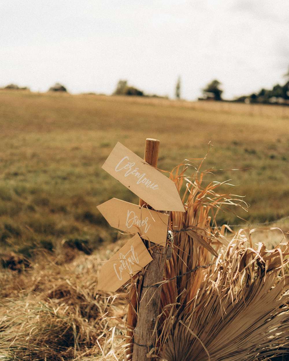 À l’entrée du champ, nous avions disposé un panneau d’accueil en bois clair végétalisé, posé sur un chevalet, à son pied une grande dame Jeanne. Des flèches directionnelles étaient également là pour guider les invités, en bois clair, écriture blanche.