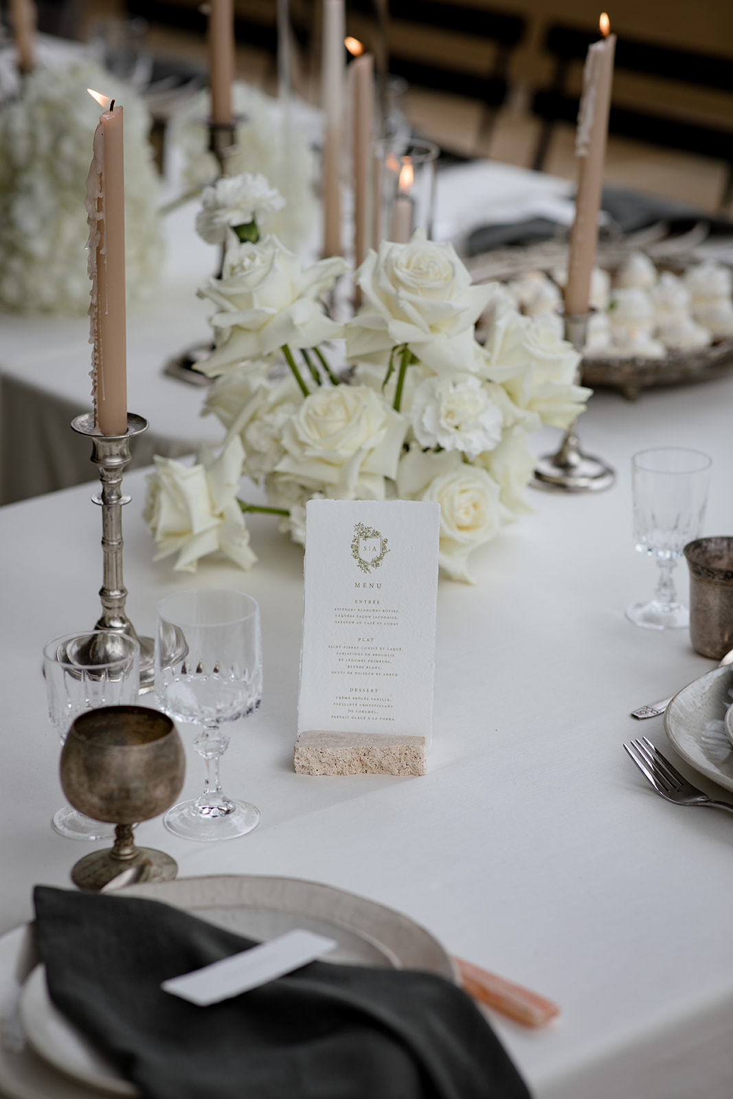 Mobilier : Support en travertin asymétrique ; chandeliers/bougeoirs argent ; verre a vin ciselé ; verre argent