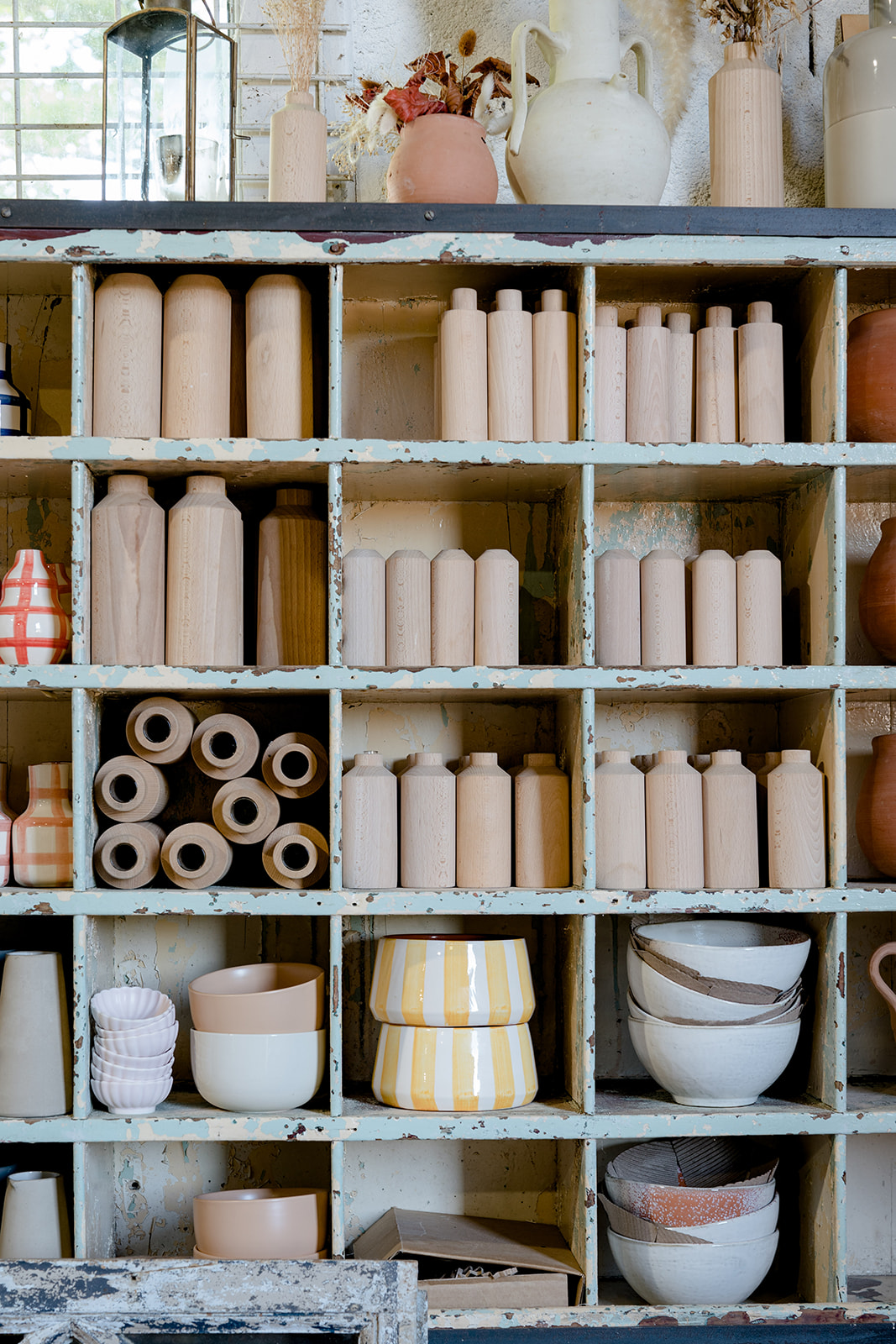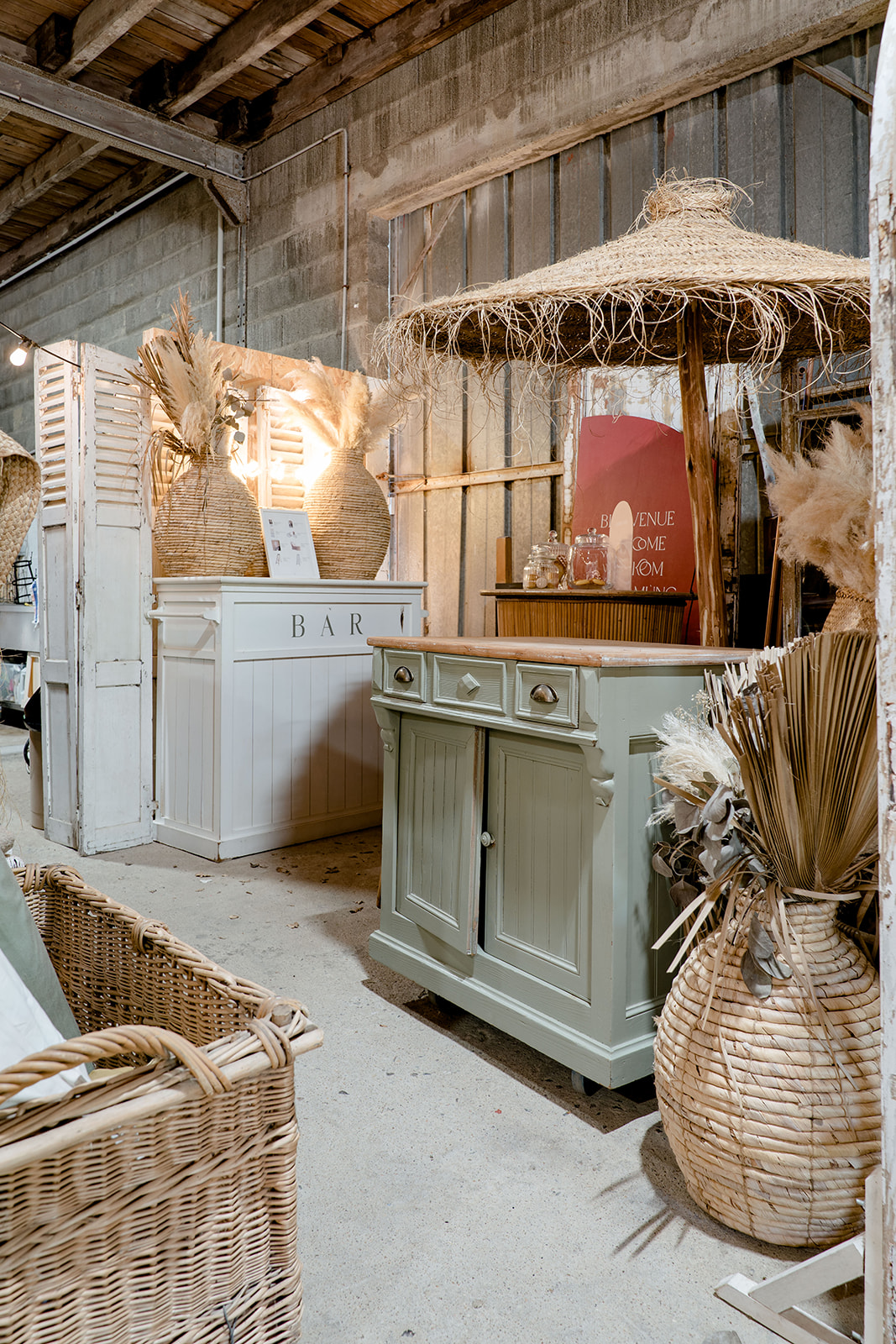 Mobilier : collection de vases OBDD ; comptoir “Justine” ; Jarre Bambou ; Parasol bois “Hélios” ; collection petite déco bois OBDD ; coussin de sol jute écru rectangle